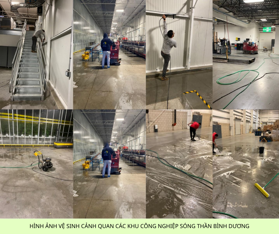 Vệ Sinh Hàng Ngày & Định Kỳ: Quét, hút bụi, xử lý vết bẩn cứng đầu trên Sàn Nhà Xưởng bằng máy chà sàn công nghiệp. Cung cấp Tạp vụ chuyên nghiệp cho khu vực văn phòng và tiện ích.