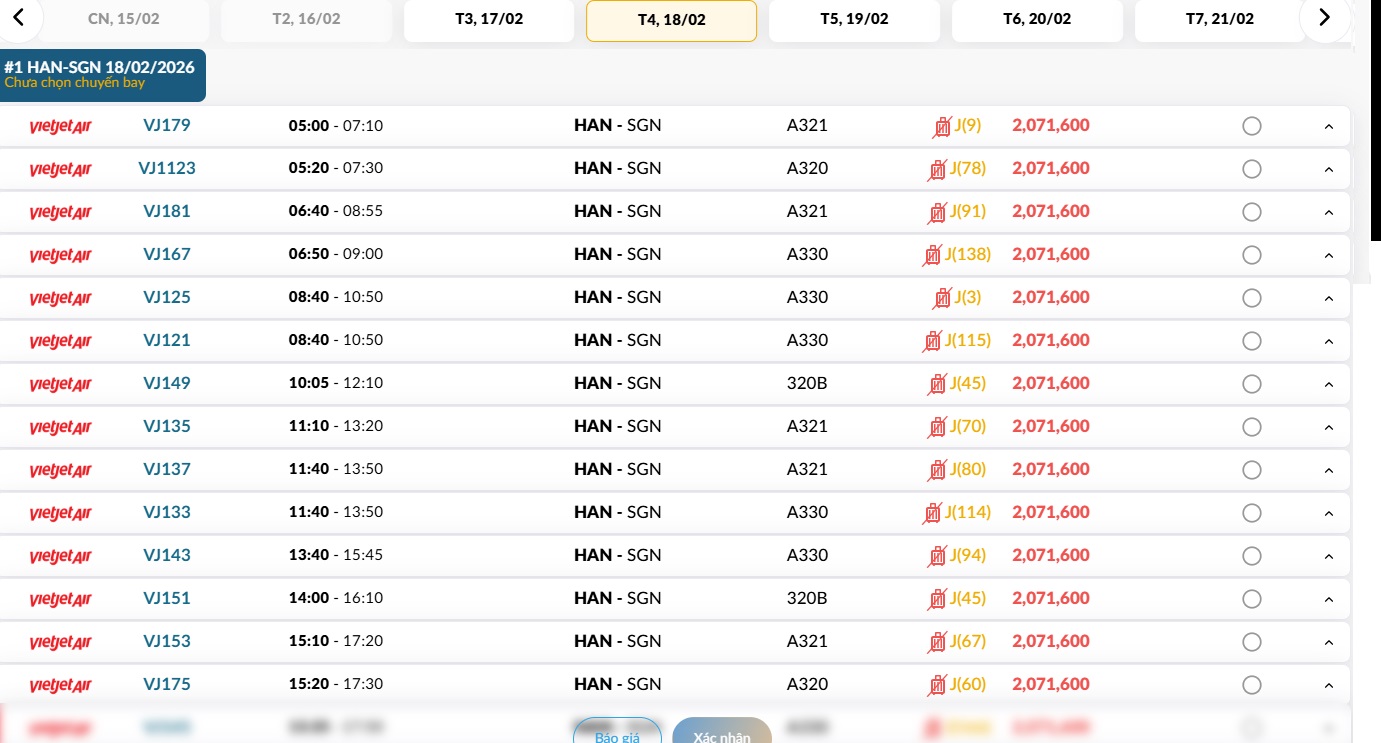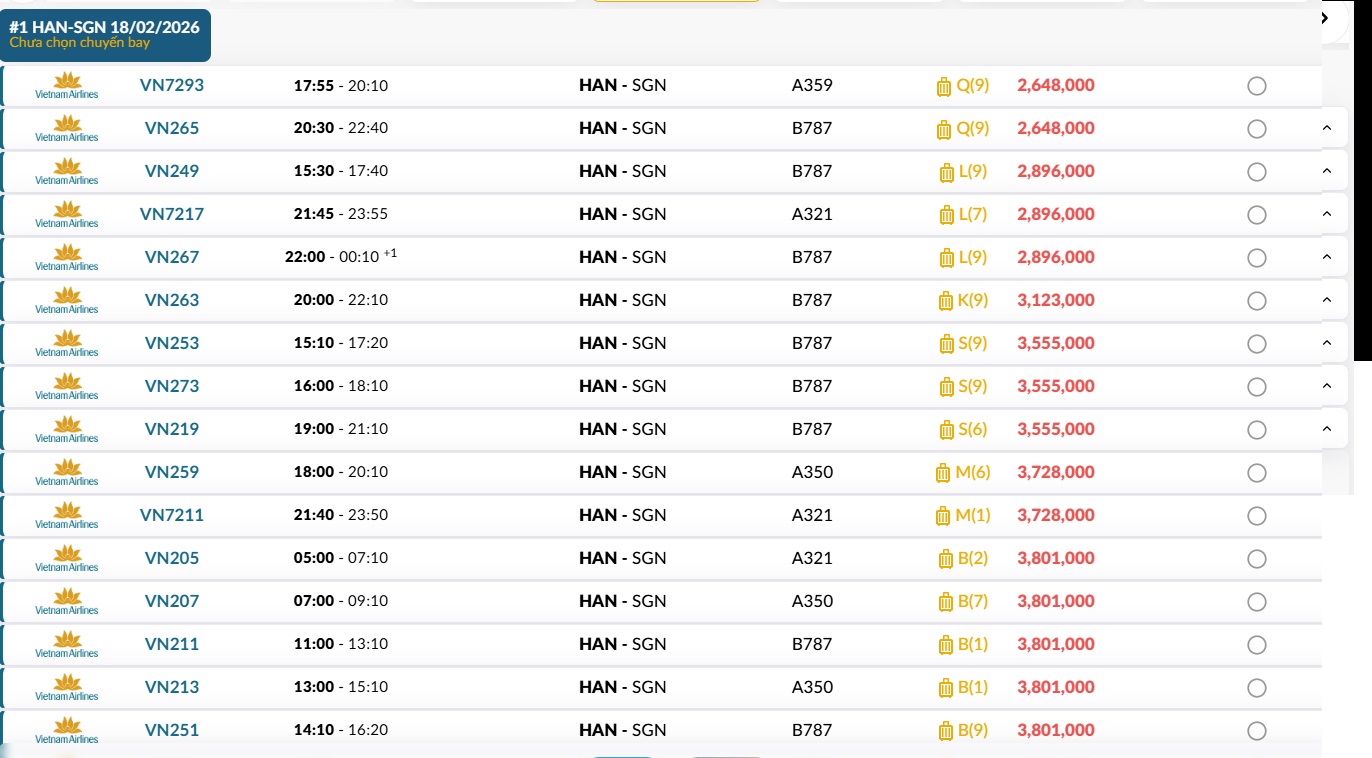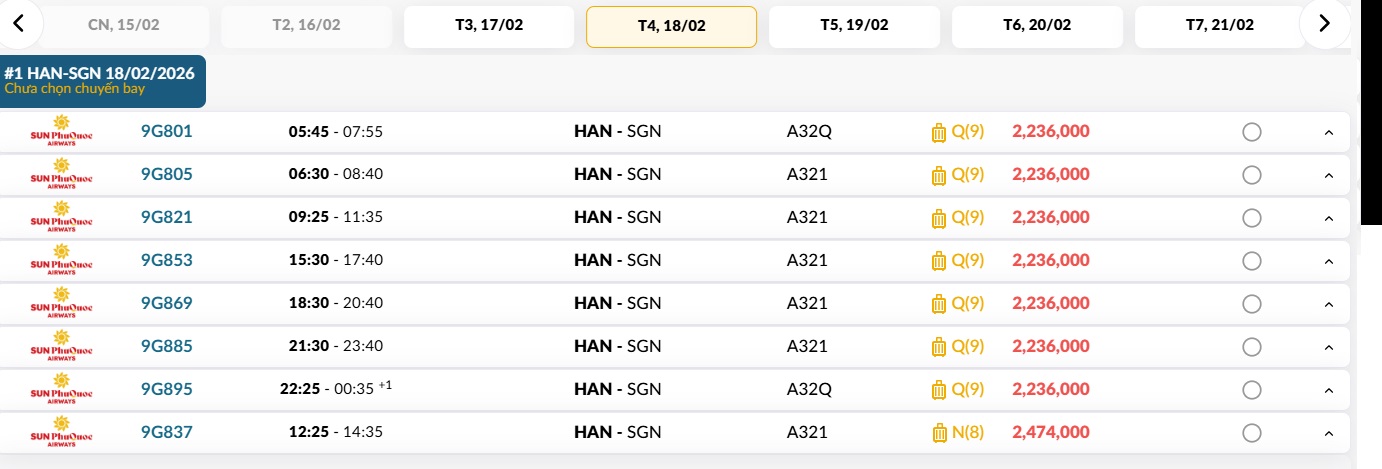Hà Nội - TP. Hồ Chí Minh (SGN) Thứ tư 18/02/2026 Mồng 2 têt