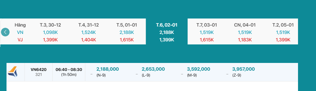 VJ212 06:15-08:15 Vé Máy Bay 1,399,000 VJ1216 16:20-18:05 Vé Máy Bay 1,399,000 VJ1212 08:00-09:50 Vé Máy Bay 1,615,000 VJ210 10:40-12:30 Vé Máy Bay 1,615,000 VJ228 14:30-16:20 Vé Máy Bay 1,615,000 VJ220 17:50-19:50 Vé Máy Bay 1,615,000 VN6420 06:40-08:30 Vé Máy Bay 2,188,000 VN1264 11:10-12:55 Vé Máy Bay 2,653,000 VN1266 13:50-15:35 Vé Máy Bay 2,653,000 VN1268 18:45-20:30 Vé Máy Bay 2,653,000 VN1280 21:20-23:05 Vé Máy Bay 2,653,000 đã bao gồm phí Liên hệ: 0925642617 - 0964507862 - (0886912037 số này có zalo)