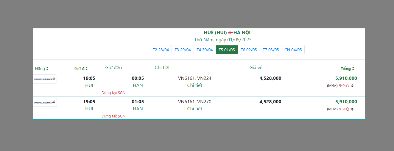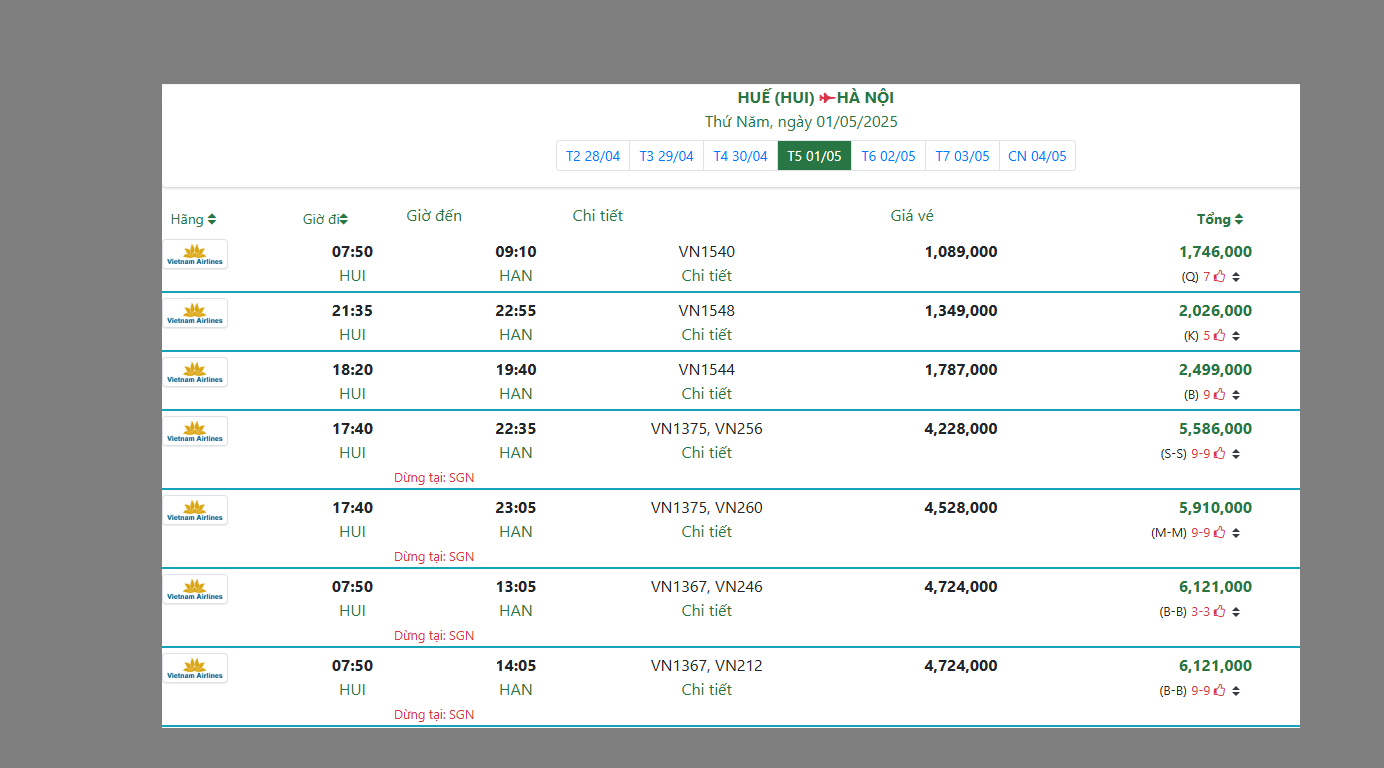 HUẾ (HUI) HÀ NỘI Thứ Năm, ngày 01/05/2025
