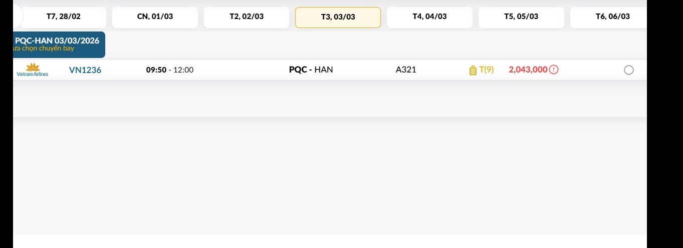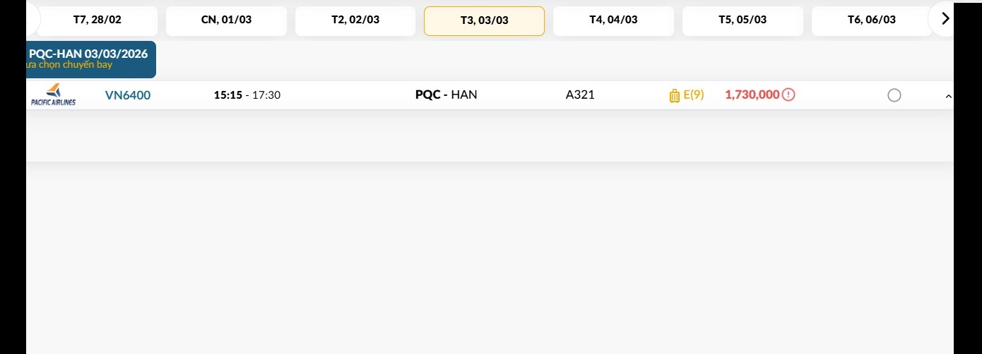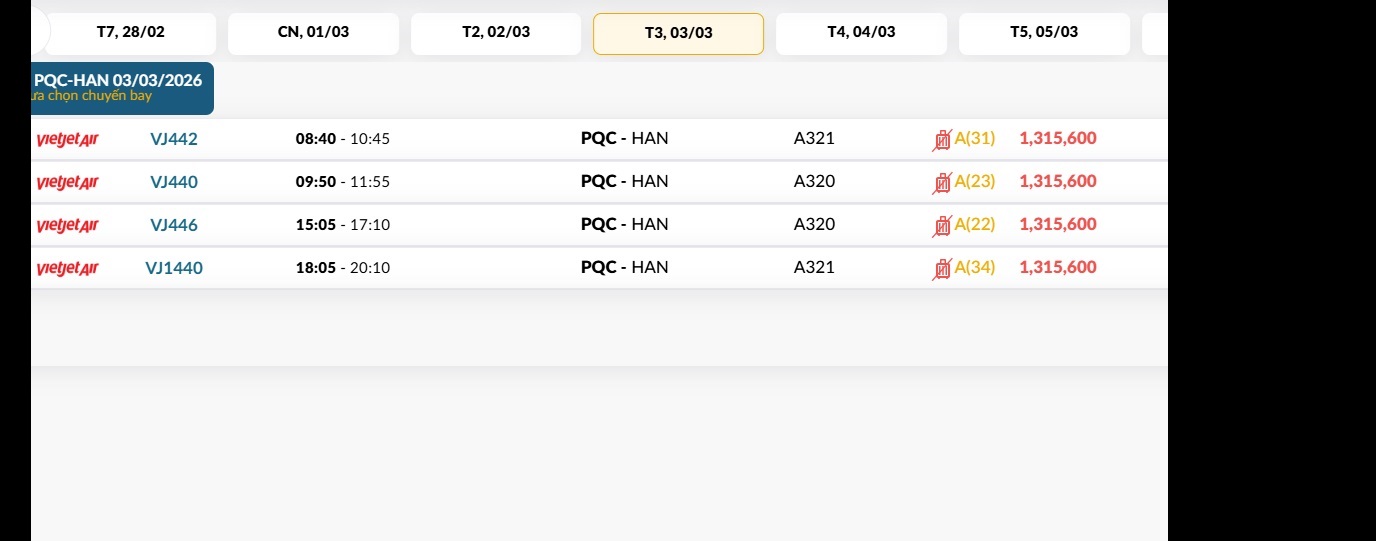 Phú Quốc (PQC) - Hà Nội (HAN) Thứ ba 03/03/2026