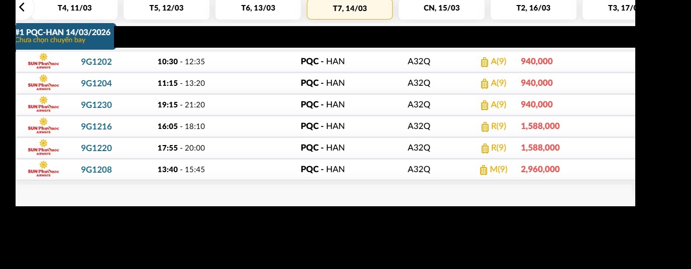 Phú Quốc (PQC) - Hà Nội (HAN) Thứ bảy 14/03/2026