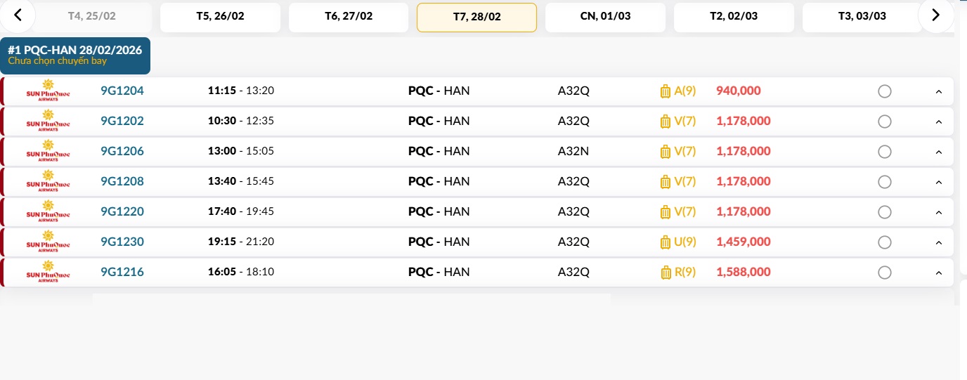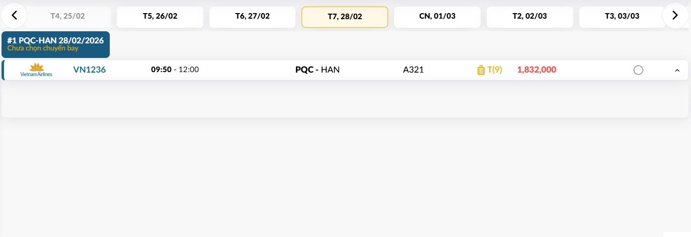 Phú Quốc (PQC) - Hà Nội (HAN) Thứ bảy 28/02/2026