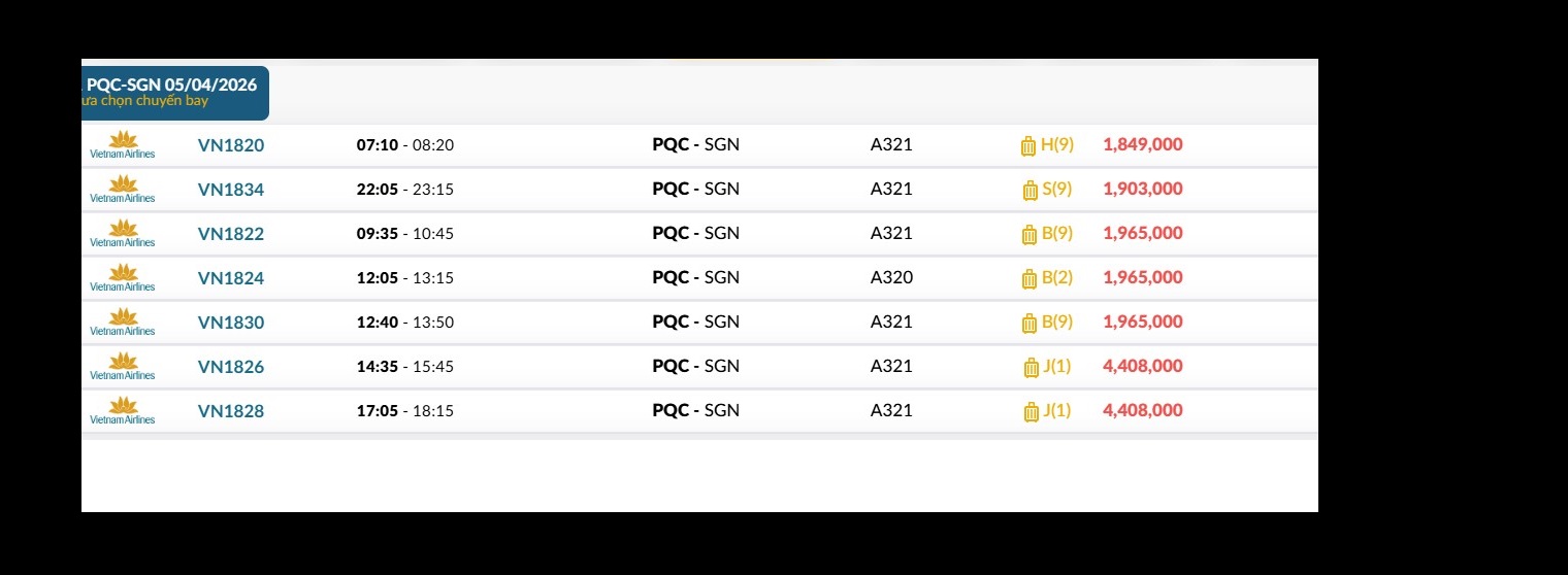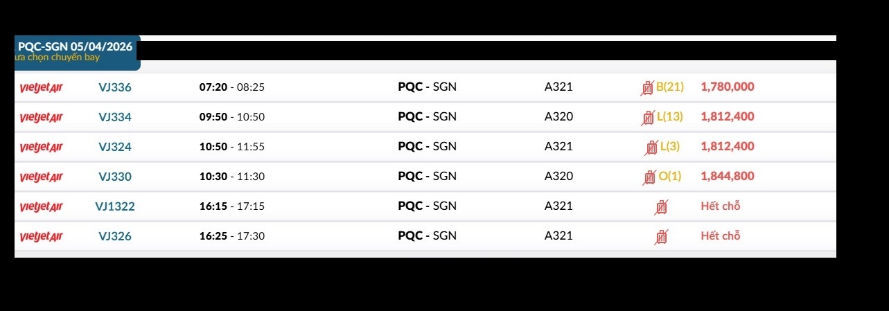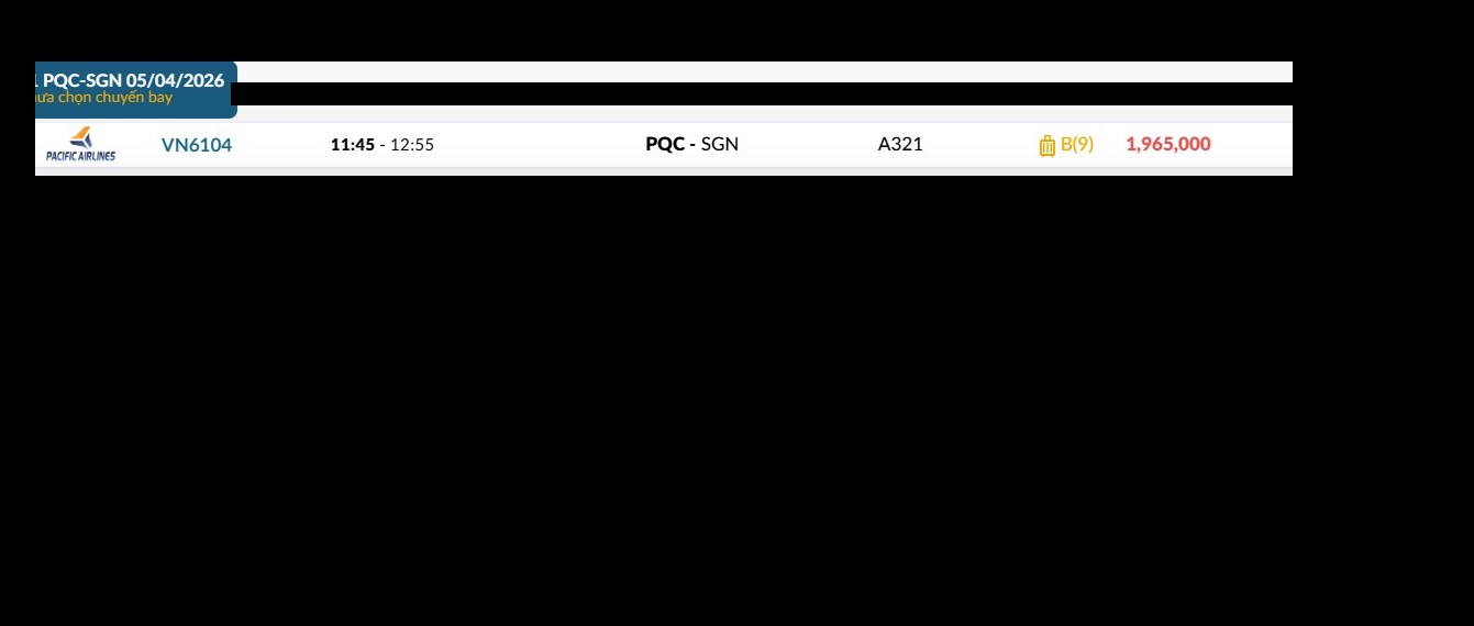Phú Quốc (PQC) - TP. Hồ Chí Minh (SGN) Chủ nhật 05/04/2026