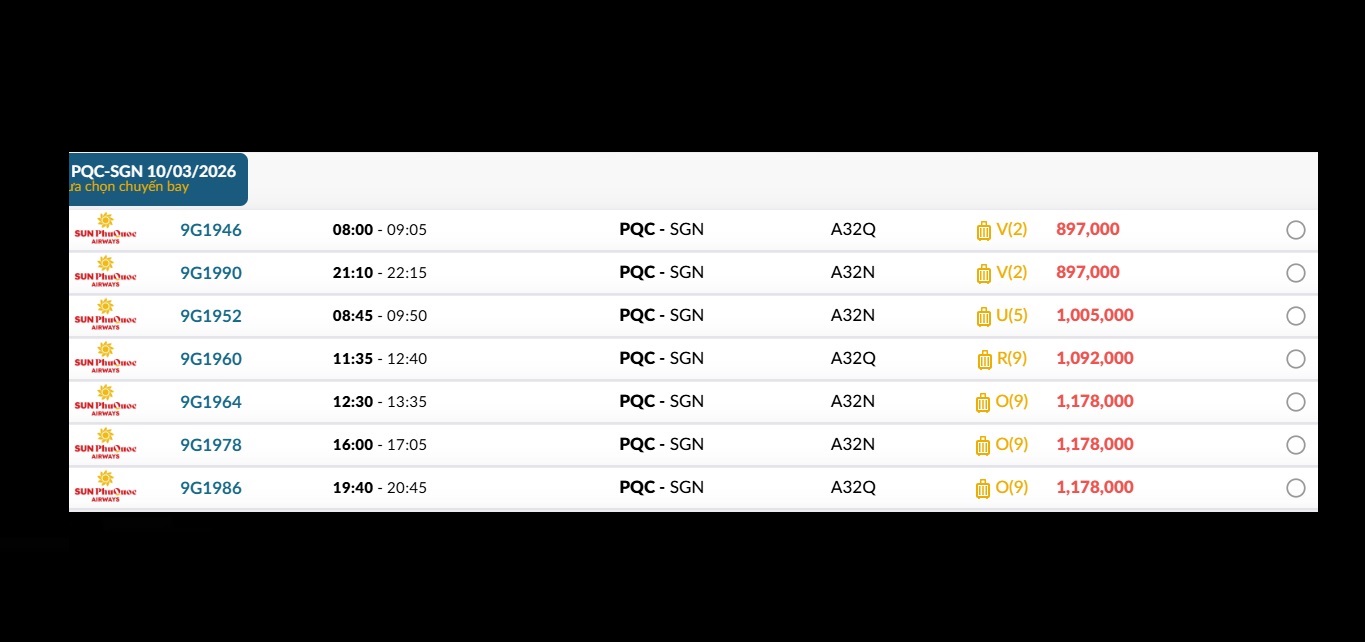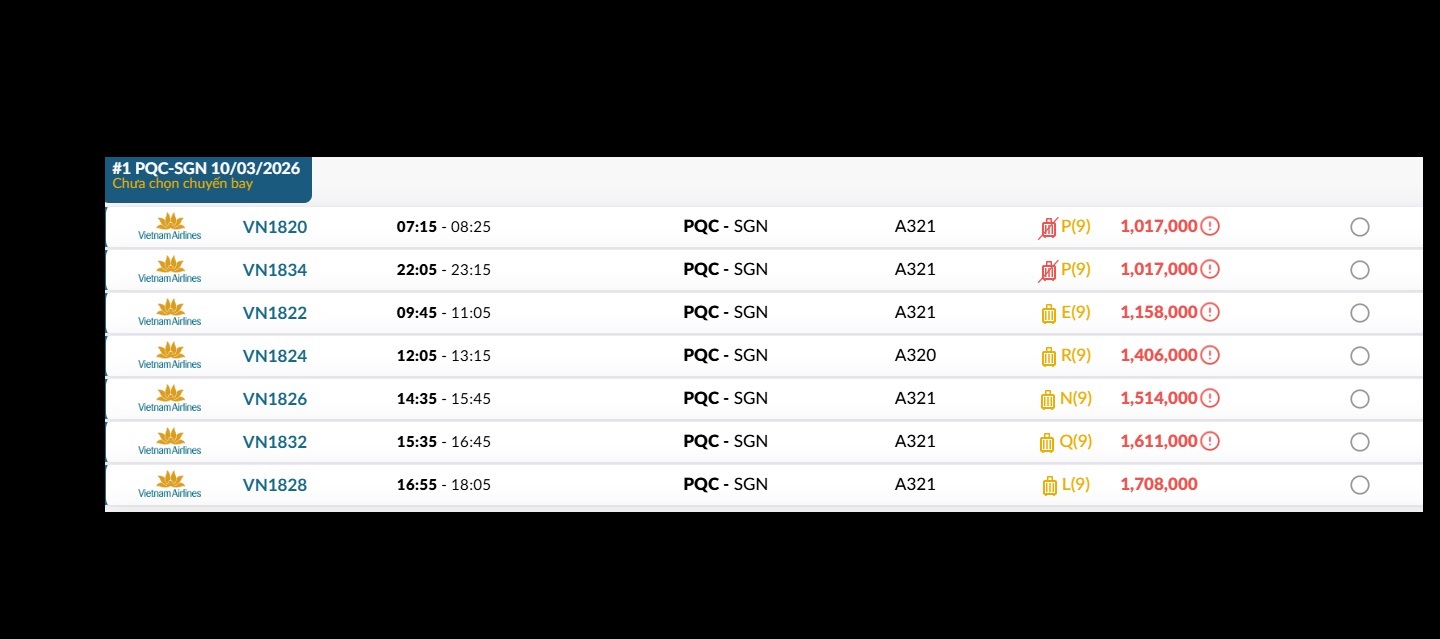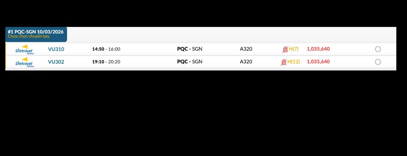 Phú Quốc (PQC) - TP. Hồ Chí Minh (SGN) Thứ ba 10/03/2026