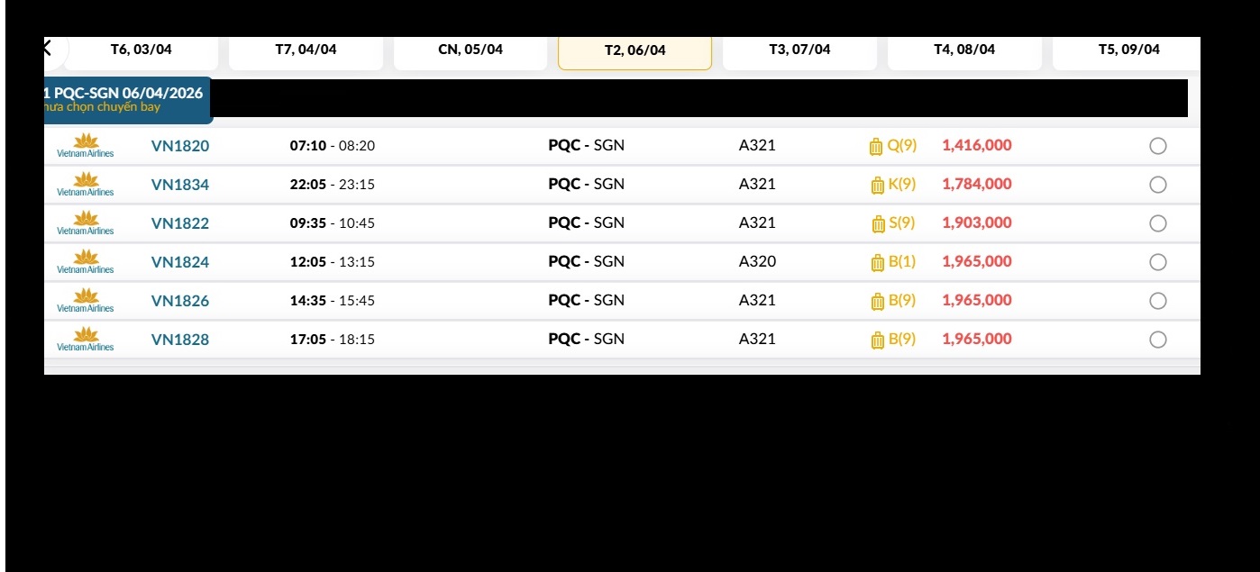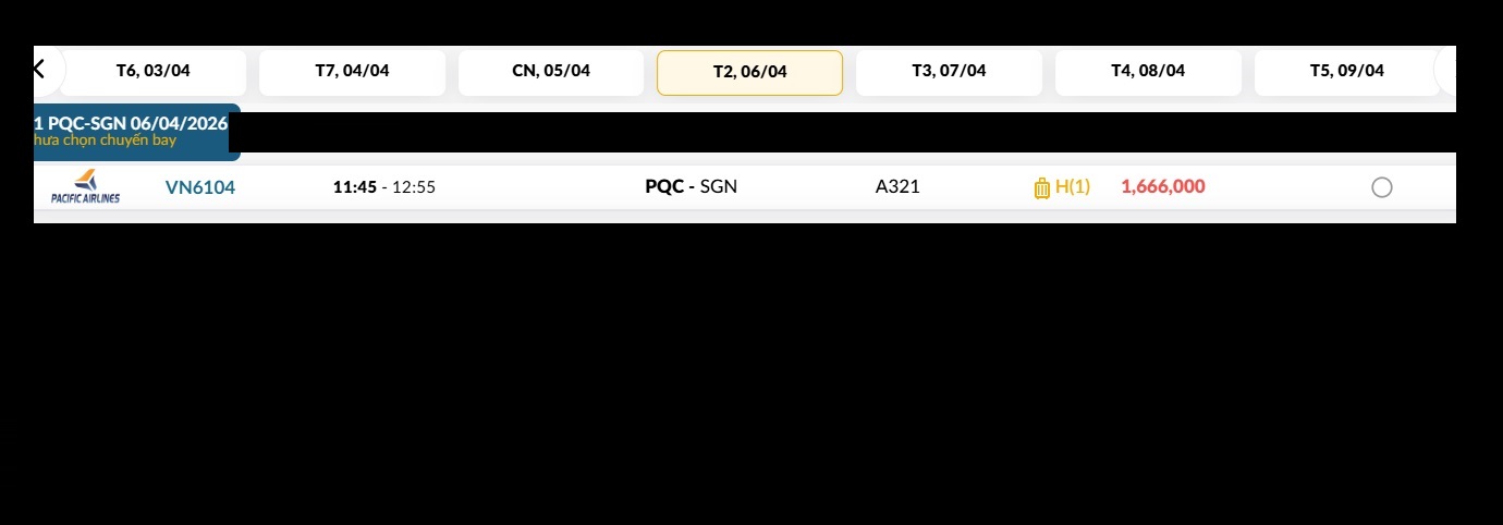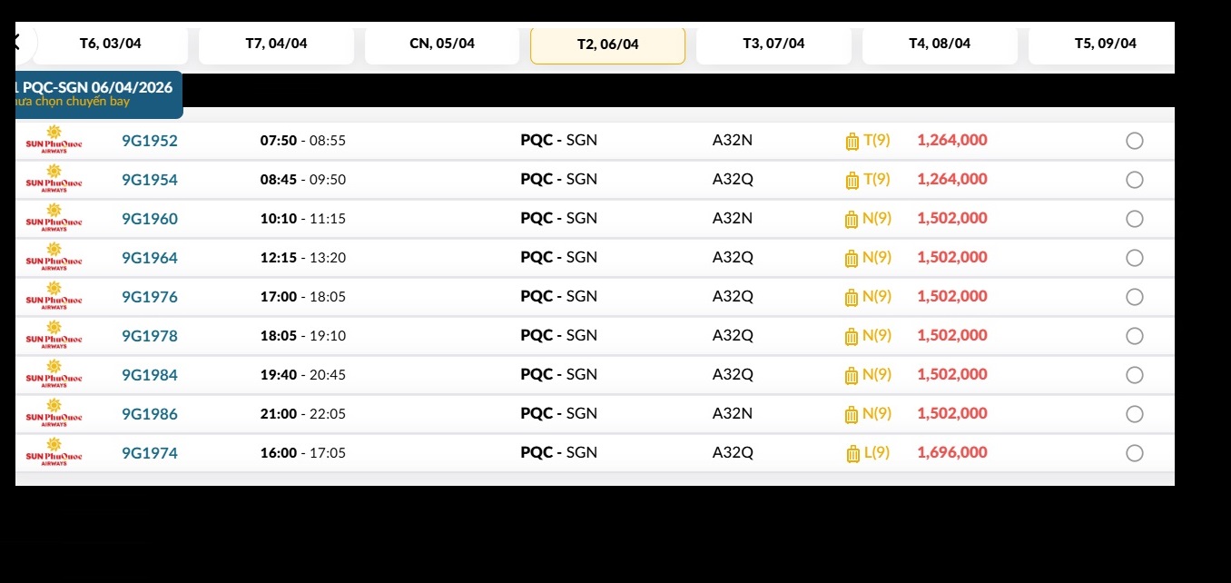 Phú Quốc (PQC) - TP. Hồ Chí Minh (SGN) Thứ hai 06/04/2026