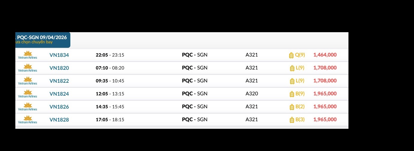 Phú Quốc (PQC) - TP. Hồ Chí Minh (SGN) Thứ năm 09/04/2026