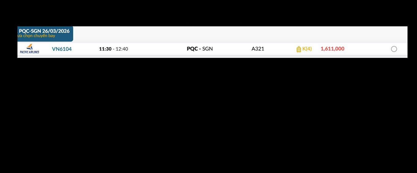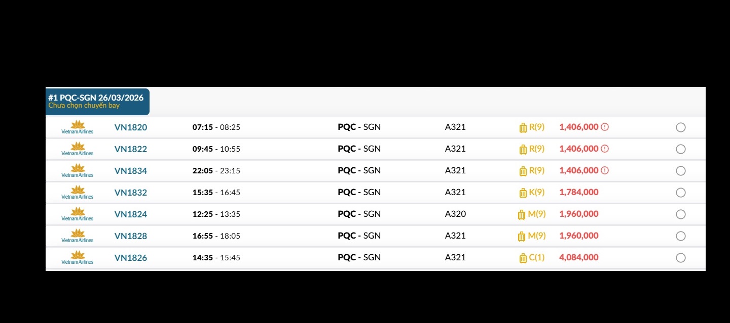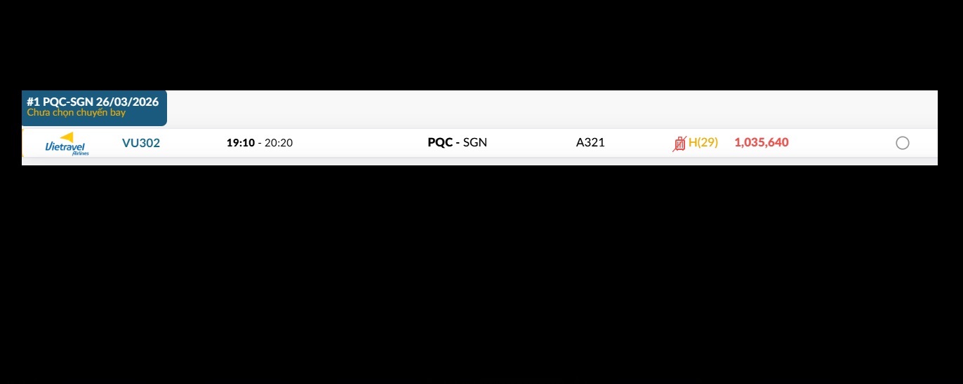 Phú Quốc (PQC) - TP. Hồ Chí Minh (SGN) Thứ năm 26/03/2026