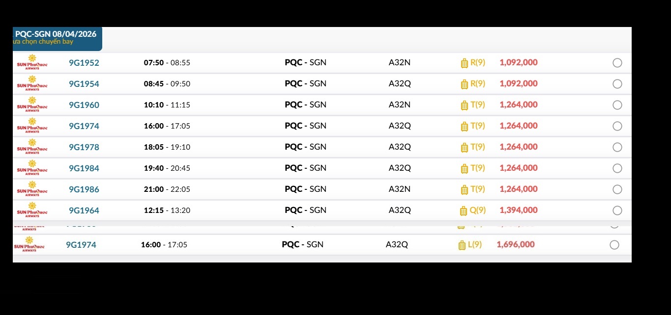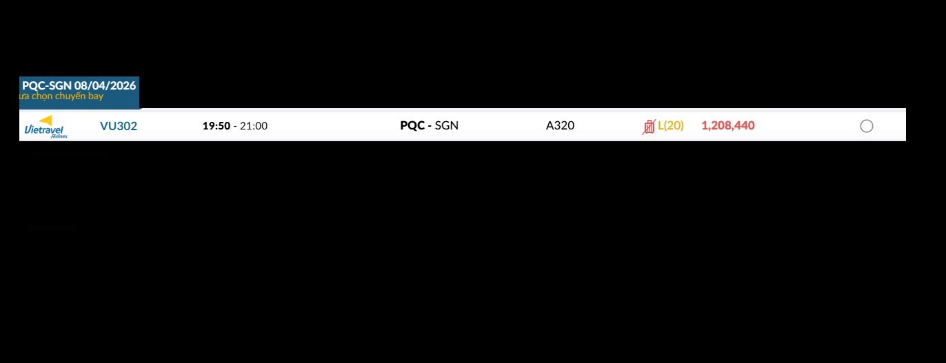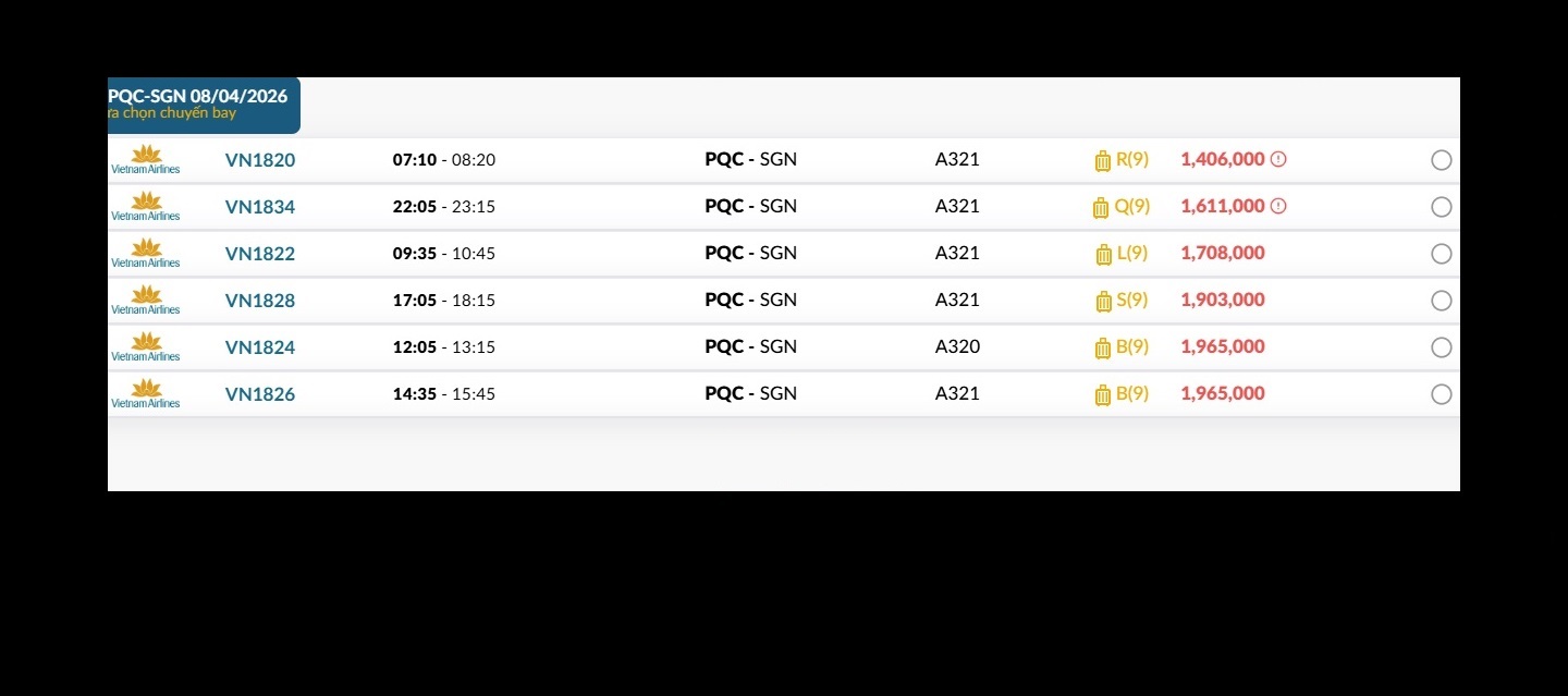 Phú Quốc (PQC) - TP. Hồ Chí Minh (SGN) Thứ tư 08/04/2026