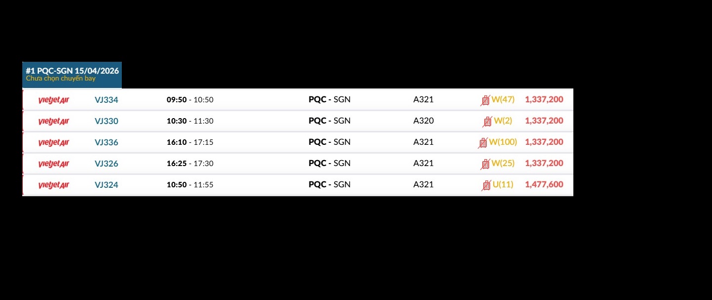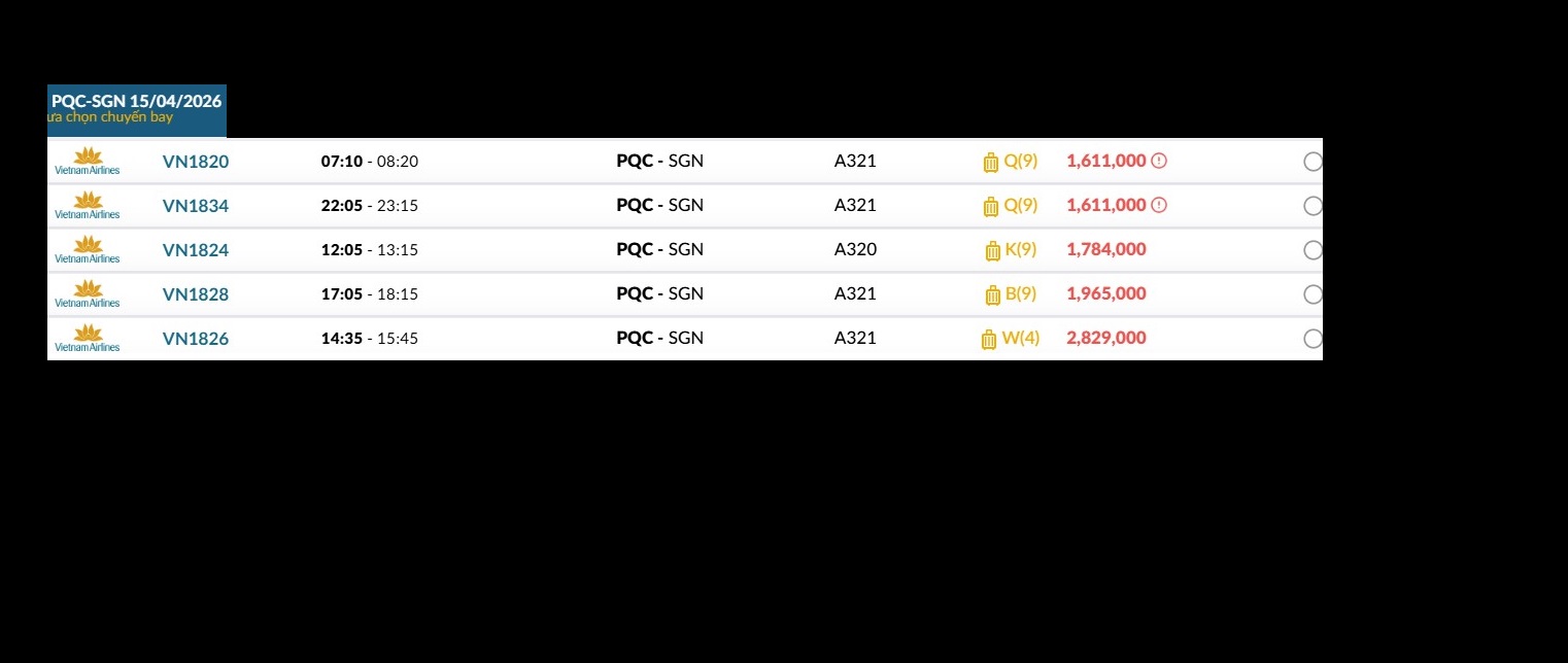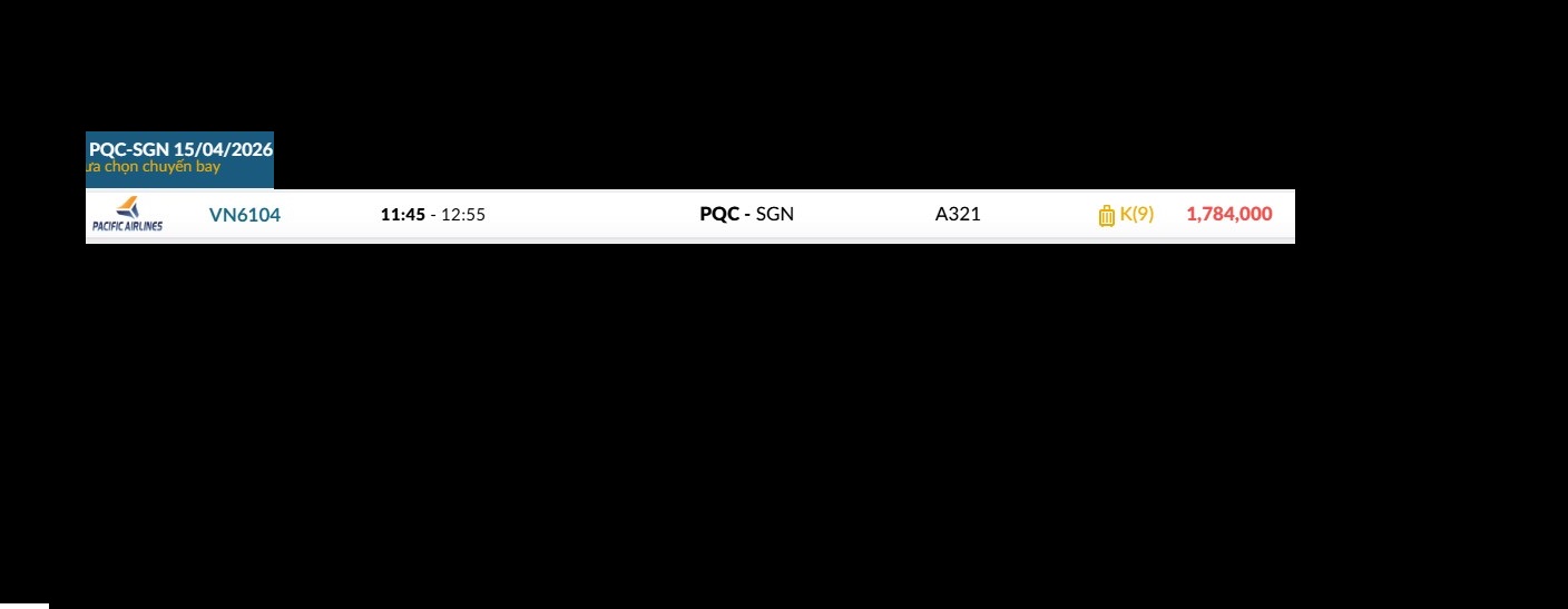 Phú Quốc (PQC) - TP. Hồ Chí Minh (SGN) Thứ tư 15/04/2026