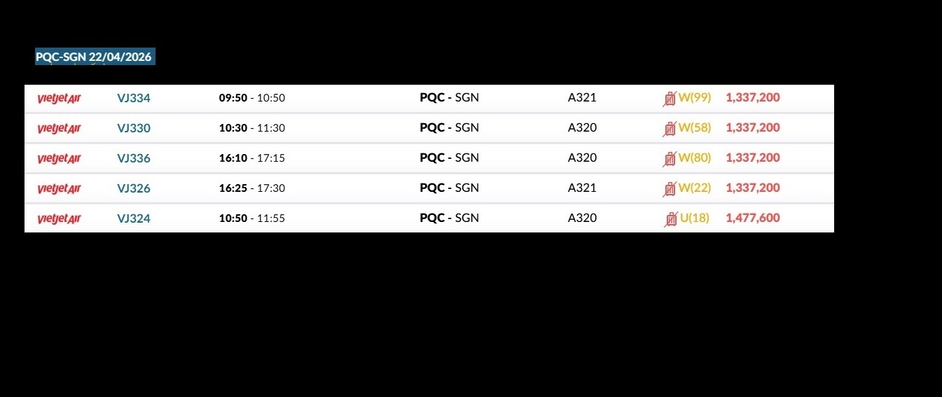 Phú Quốc (PQC) - TP. Hồ Chí Minh (SGN) Thứ tư 22/04/2026