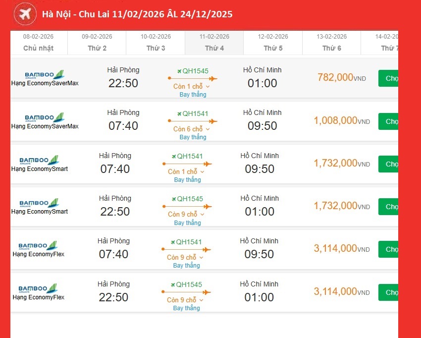 Vé máy bay Hải Phòng Hồ Chí Minh 11/02/2026 ÂL 24/12/2025