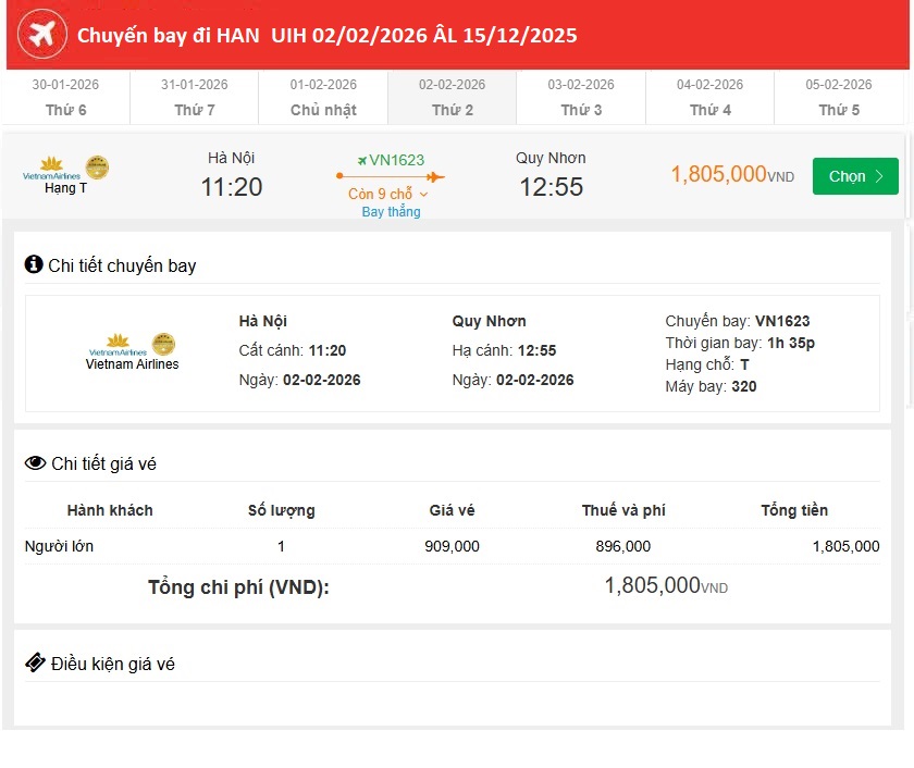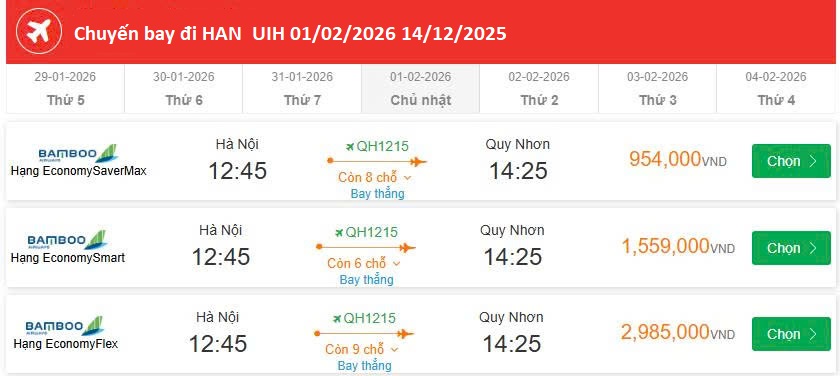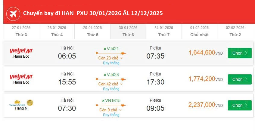 Chuyến bay đi HAN PXU 30/01/2026 ÂL 12/12/2025