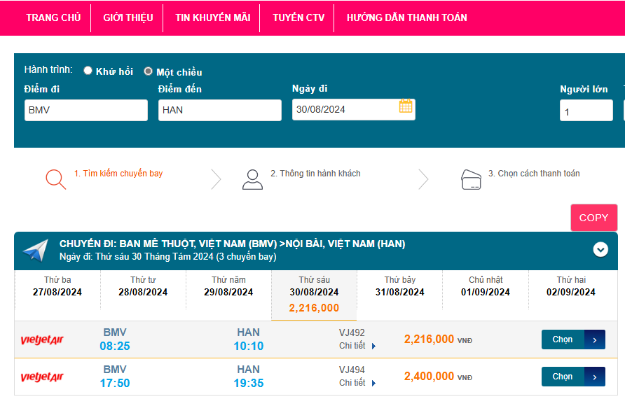 Ban Mê Thuột (BMV) - Nội Bài (HAN) 30/08/2024