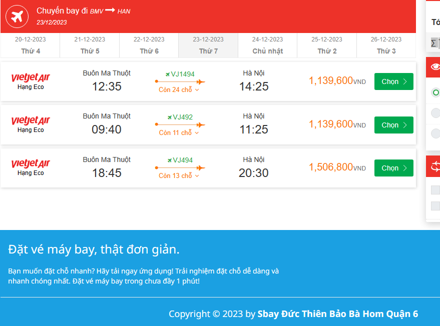 Buôn Ma Thuột (BMV) Đến Hà Nội (HAN) thứ bảy 23-12-2023