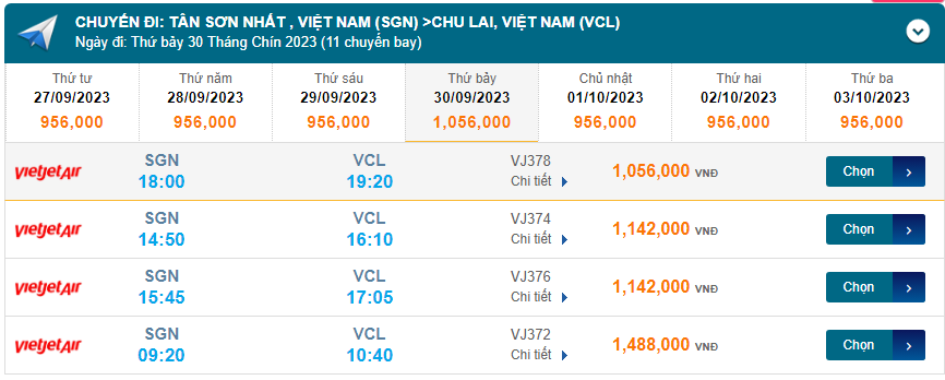 Cam Ranh (CXR) đến Chu Lai (VCL) thứ bảy 30/09/2023