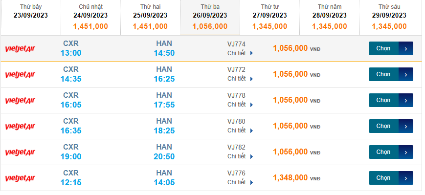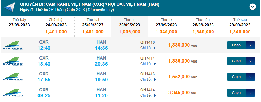 Cam Ranh (CXR) đến Nội Bài (HAN) thứ ba 26/09/2023