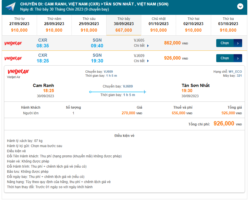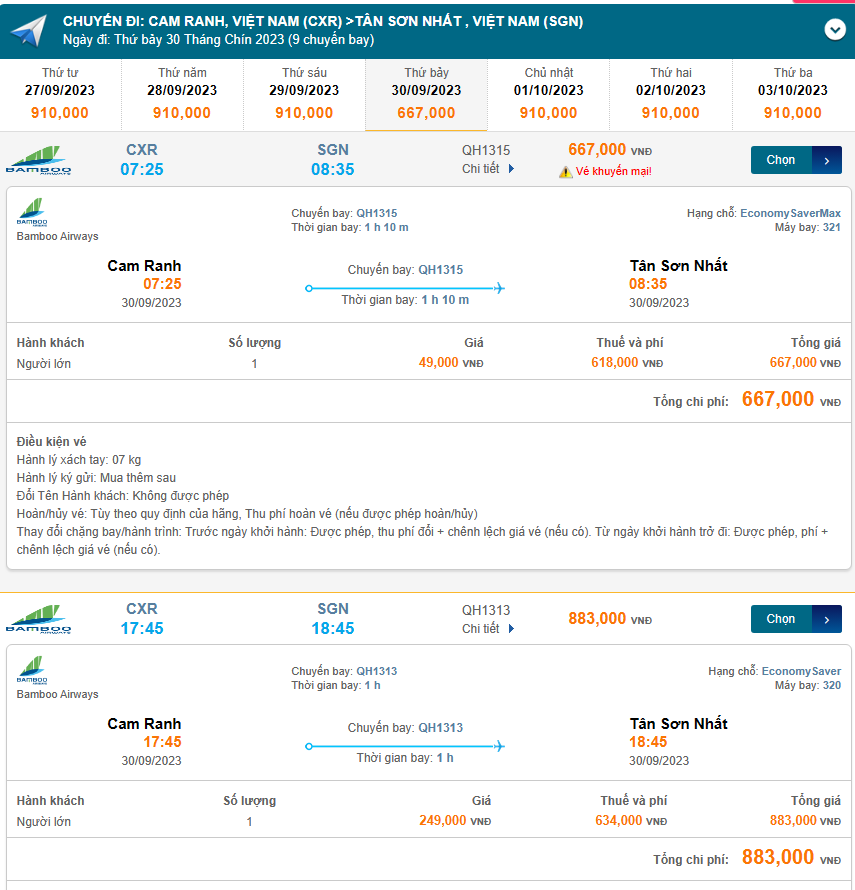 Cam Ranh (CXR) đến Tân Sơn Nhất (SGN) thứ bảy 30/09/2023