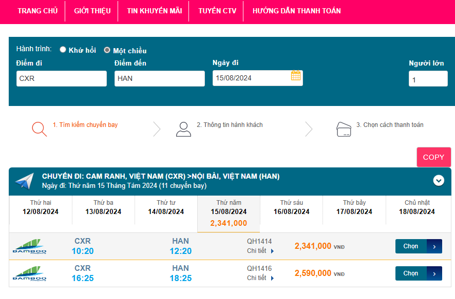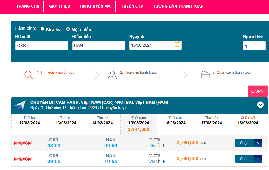 Cam Ranh (CXR) - Nội Bài (HAN) 15/08/2024
