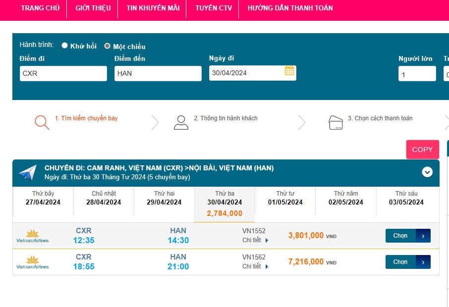 Cam Ranh (CXR) - Nội Bài (HAN) 30/04/2024