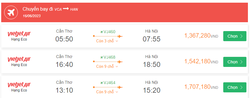 Vietjet Air Cần Thơ Cất cánh: 05:50 Ngày: 16-06-2023 Hà Nội Hạ cánh: 07:55 Ngày: 16-06-2023 Chuyến bay: VJ460 giá vé máy bay giá 1,367,280VND