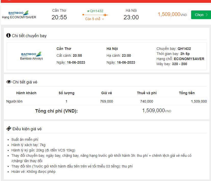 Bamboo Airways Cần Thơ Cất cánh: 20:55 Ngày: 16-06-2023 Hà Nội Hạ cánh: 23:00 Ngày: 16-06-2023 Chuyến bay: QH1432 giá vé máy bay giá 1,509,000VND