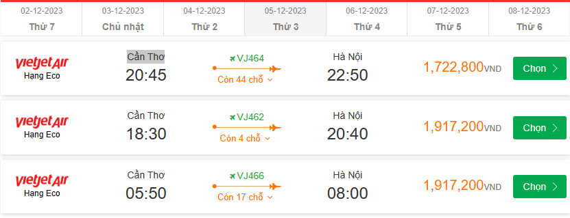 Vietjet Air Cần Thơ Cất cánh: 20:45 Ngày: 05-12-2023 Hà Nội Hạ cánh: 22:50 Ngày: 05-12-2023 Chuyến bay: VJ464 Giá Vé Máy Bay 1,722,800VND