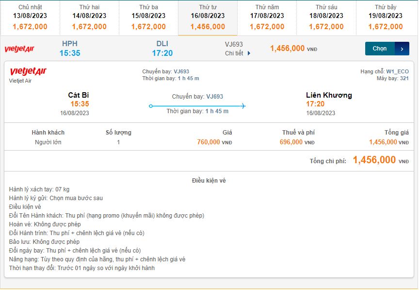 Cát Bi (HPH) đến Liên Khương (DLI) Thứ ba 16/08/2023