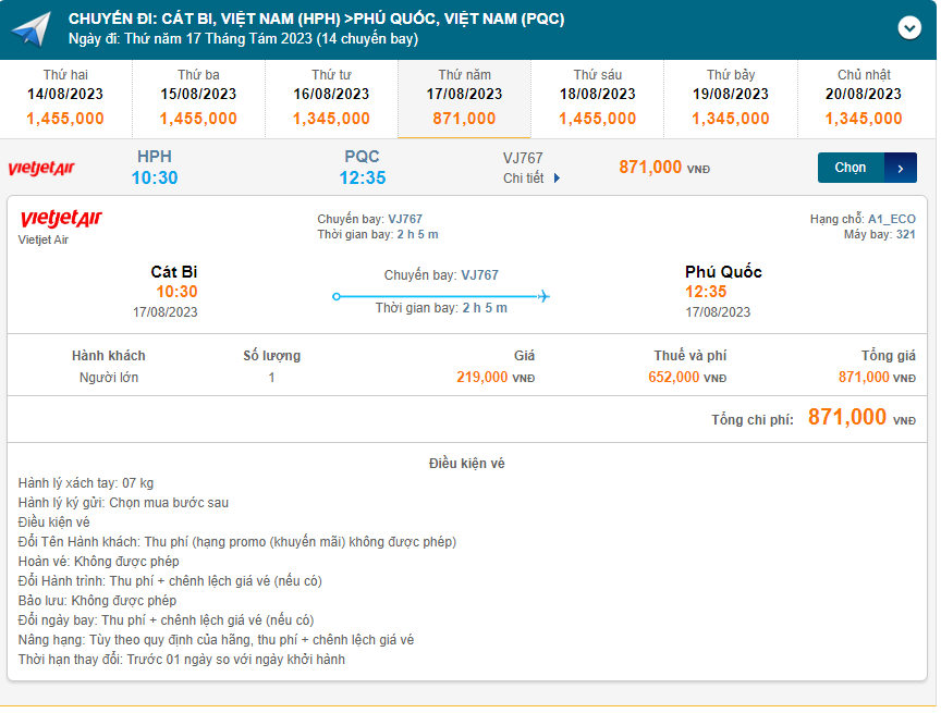 Cát Bi (HPH) đến Phú Quốc (PQC) Thứ tư 17/08/2023