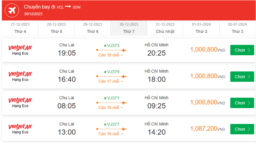 Vietjet Air Chu Lai Cất cánh: 16:40 Ngày: 30-12-2023 Hồ Chí Minh Hạ cánh: 18:00 Ngày: 30-12-2023 Chuyến bay: VJ379 giá vé máy bay 1,000,800VND