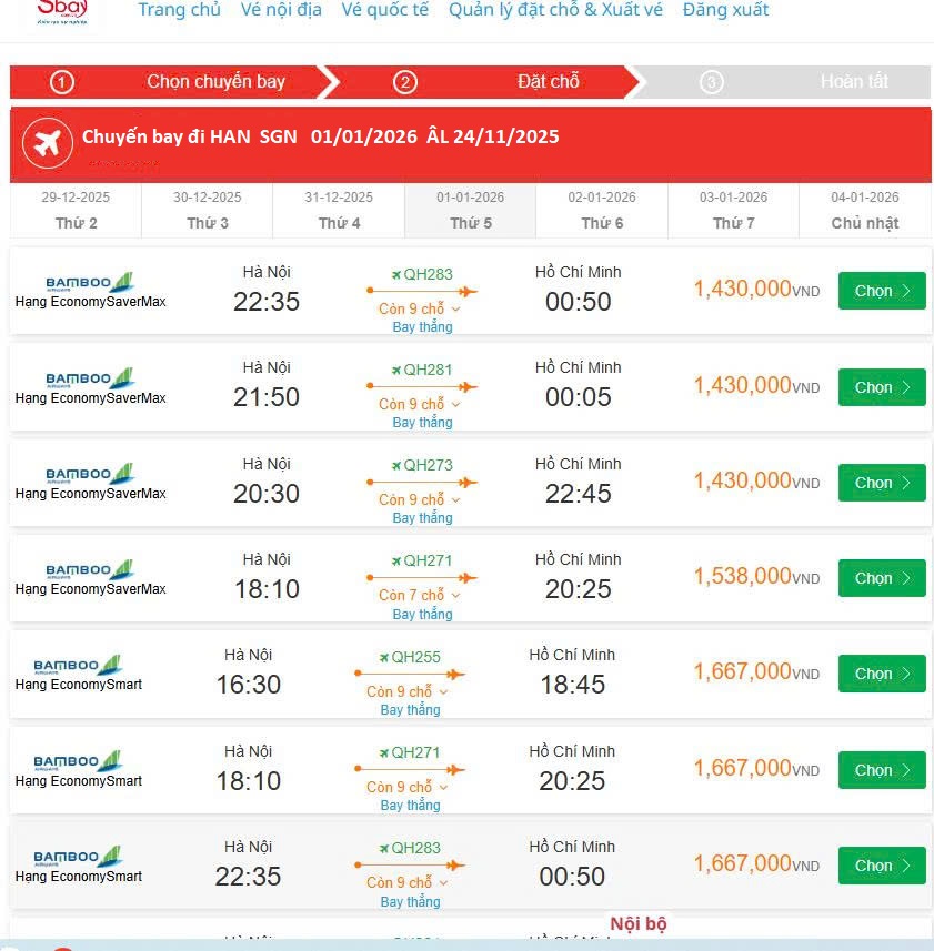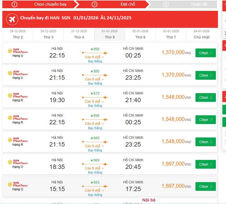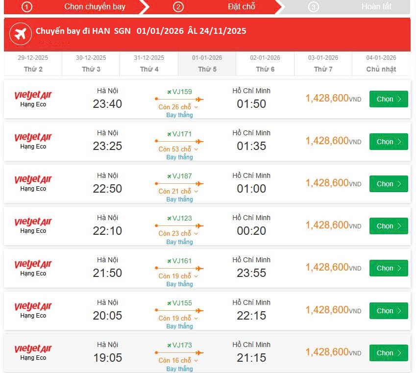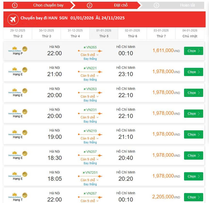 Chuyến bay đi HAN SGN 01/01/2026 ÂL 24/11/2025