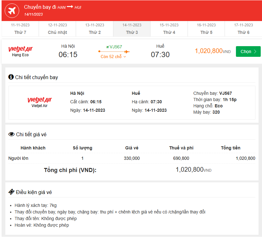 Chuyến bay Hà Nội Đến Huế thứ ba, 14-11-2023