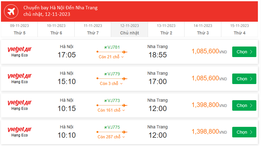 Vietjet Air Hà Nội Cất cánh: 10:15 Ngày: 12-11-2023 Nha Trang Hạ cánh: 12:00 Ngày: 12-11-2023 Chuyến bay: VJ773 Giá Vé Máy Bay 1,085,600 VND
