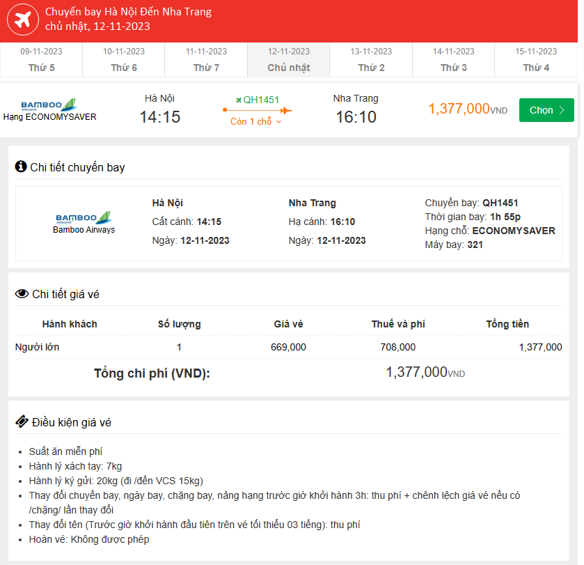 Bamboo Airways Hà Nội Cất cánh: 14:15 Ngày: 12-11-2023 Nha Trang Hạ cánh: 16:10 Ngày: 12-11-2023 Chuyến bay: QH1451 Giá Vé Máy Bay 1,377,000 VND
