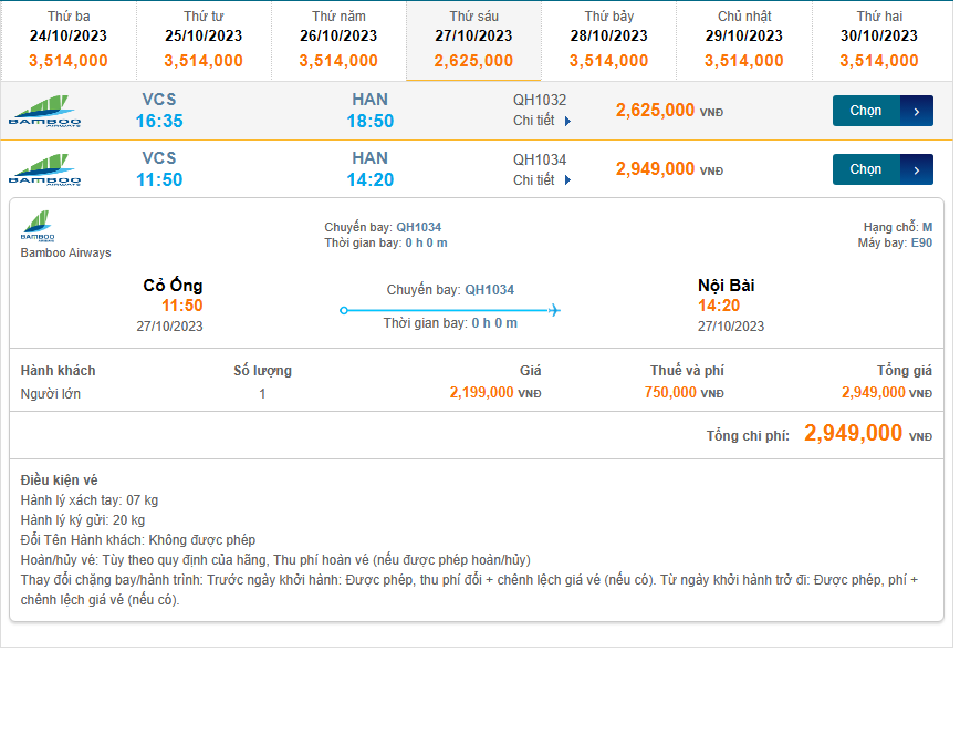 Cỏ Ống (VCS) đến Nội Bài (HAN) thủ sáu 27/10/2023