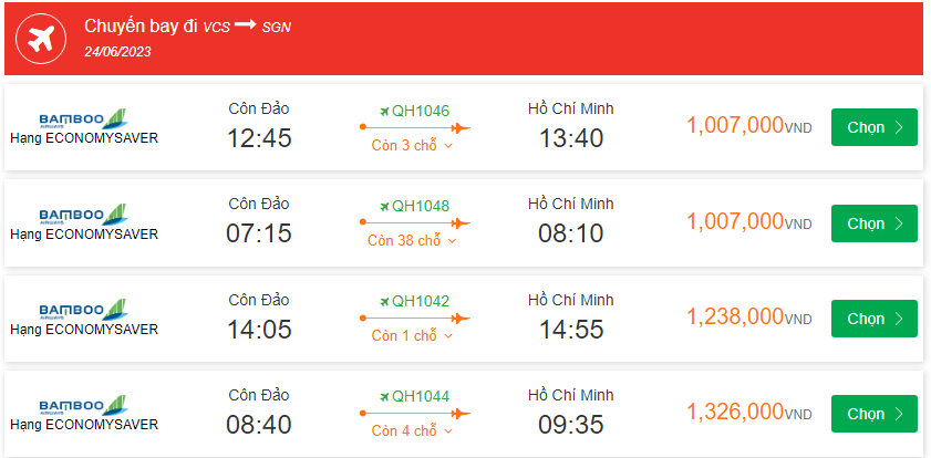 Bamboo Airways Côn Đảo Cất cánh: 14:05 Ngày: 24-06-2023 Hồ Chí Minh Hạ cánh: 14:55 Ngày: 24-06-2023 Chuyến bay: QH1042 giá vé máy bay 1,238,000VND