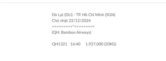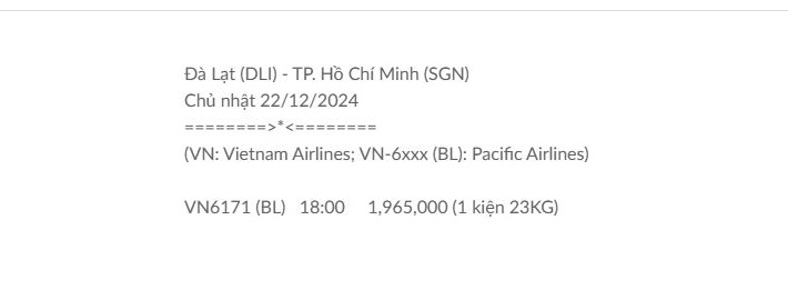 Đà Lạt (DLI) - TP. Hồ Chí Minh (SGN) Chủ nhật 22/12/2024