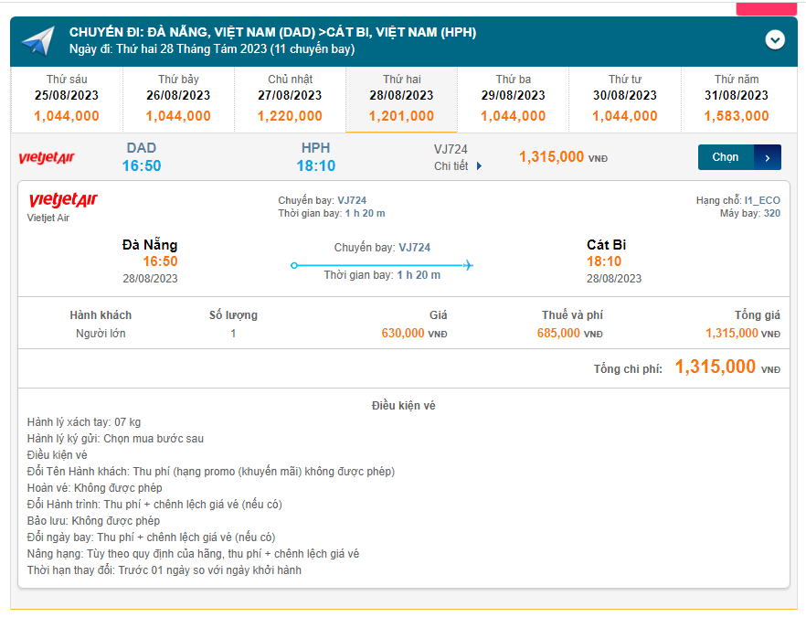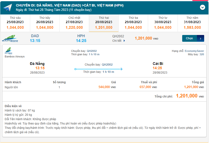 Đà Nẵng (DAD) đến Cát Bi (HPH) thứ hai 28/08/2023
