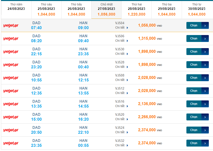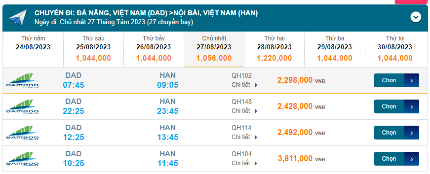 Đà Nẵng (DAD) đến Nội Bài (HAN) chủ nhật 27/08/2023