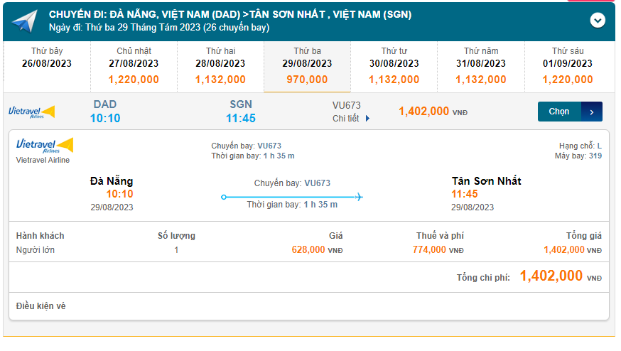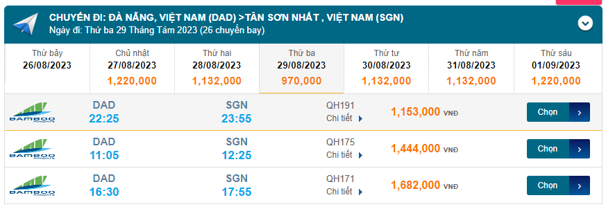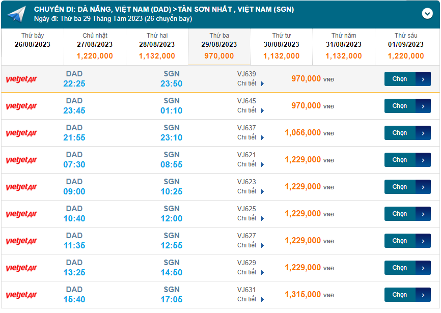 Đà Nẵng (DAD) đến Tân Sơn Nhất (SGN) thứ ba 29/08/2023