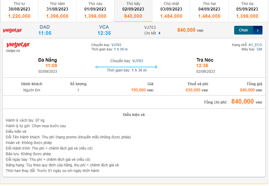 Đà Nẵng (DAD) đến Trà Nóc (VCS) thứ bảy 02/09/2023