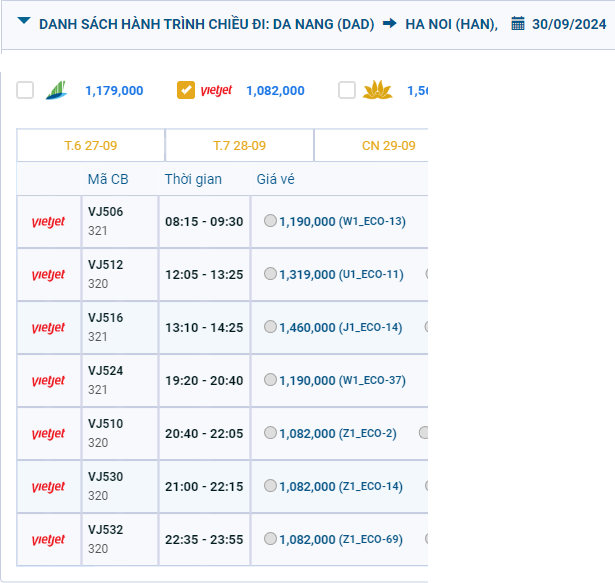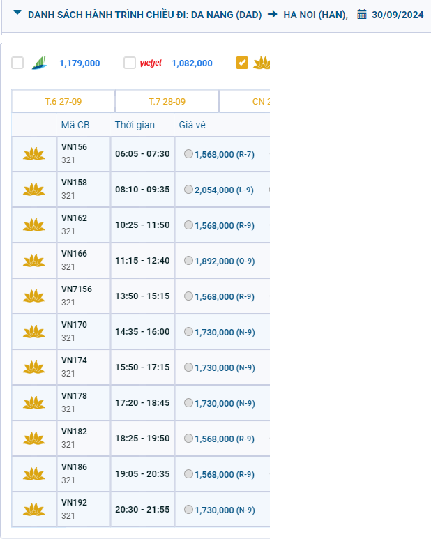 Đà Nẵng (DAD) - Nội Bài (HAN) 30/09/2024