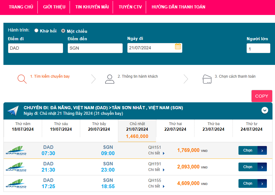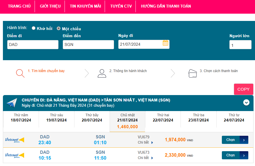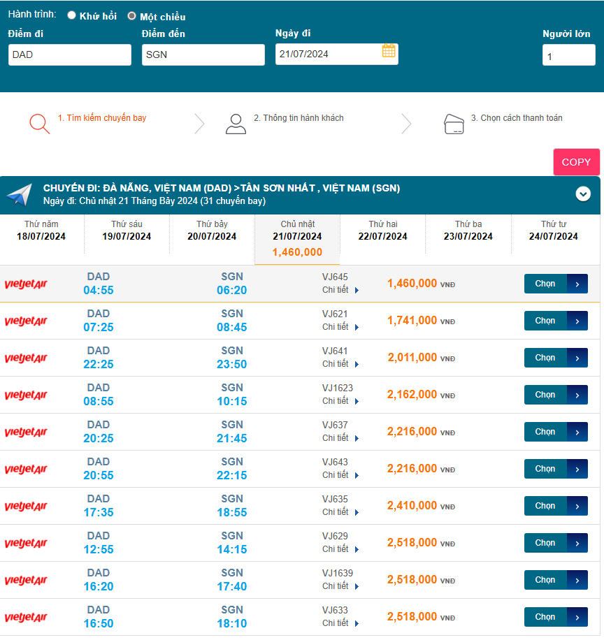 Đà Nẵng (DAD) - Tân Sơn Nhất (SGN) 21/07/2024