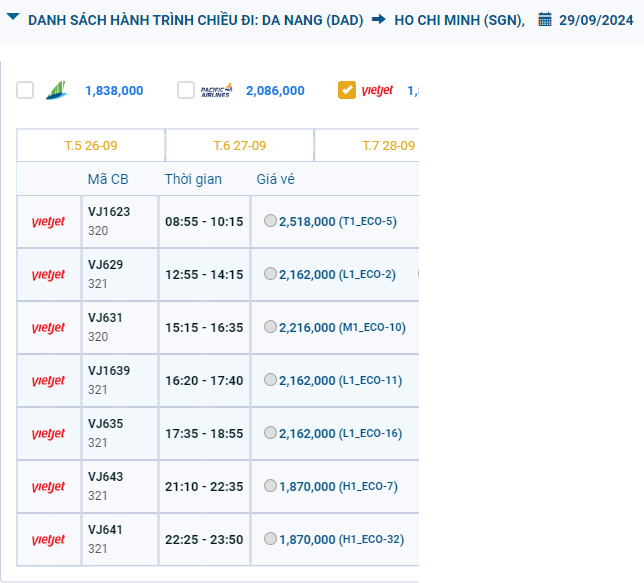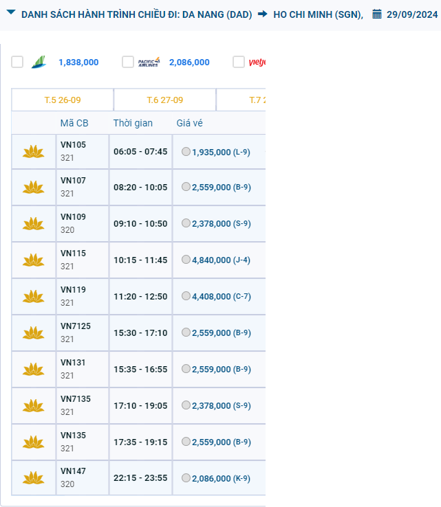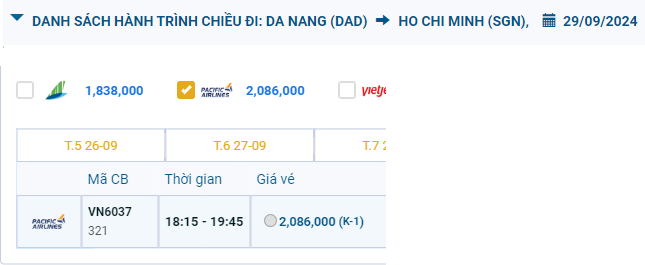 Đà Nẵng (DAD) - Tân Sơn Nhất (SGN) 29/09/2024