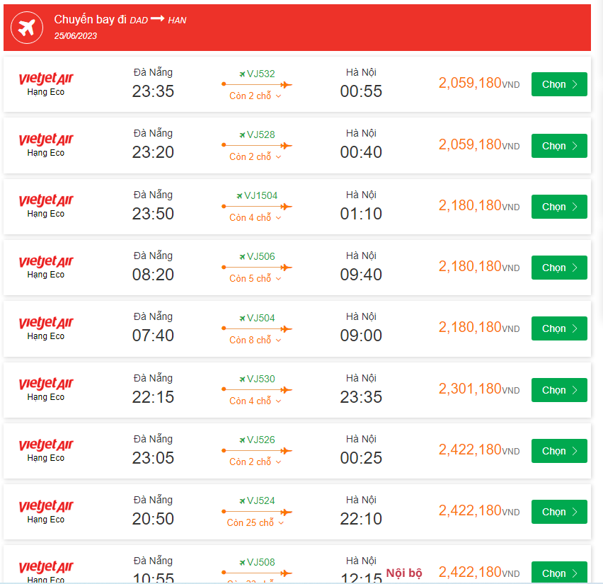 Vietjet Air Đà Nẵng Cất cánh: 08:20 Ngày: 25-06-2023 Hà Nội Hạ cánh: 09:40 Ngày: 25-06-2023 Chuyến bay: VJ506 giá vé máy bay 2,180,180VND