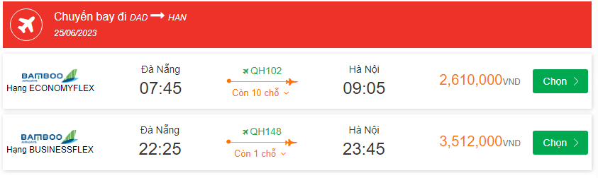 Bamboo Airways Đà Nẵng Cất cánh: 07:45 Ngày: 25-06-2023 Hà Nội Hạ cánh: 09:05 Ngày: 25-06-2023 Chuyến bay: QH102 giá vé máy bay 2,610,000VND