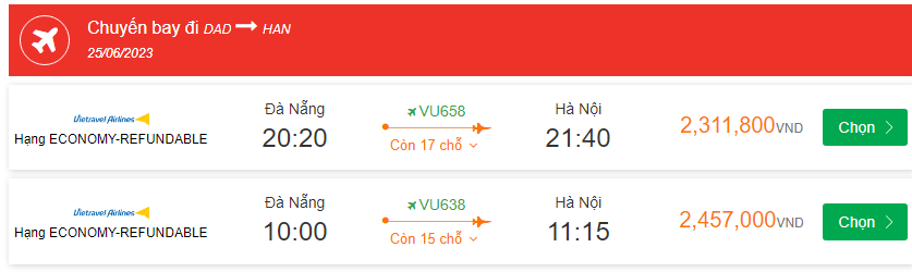 Đà Nẵng Đến Hà Nôi 25/06/2023