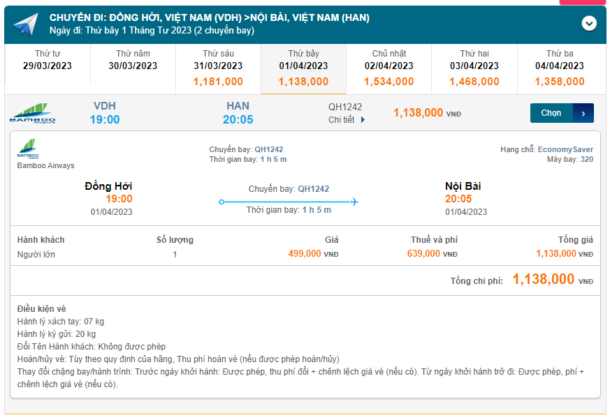 Đồng Hới (VDH) Đến Hà Noi (HAN) 05/04/2023