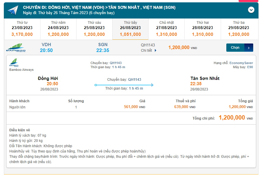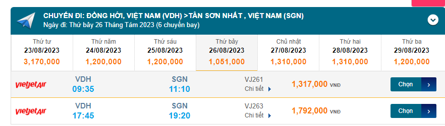 Đồng Hới (VDH) đến Tân Sơn Nhất (SGN) thứ bảy 26/08/2023