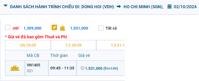 Đồng Hới (VDH) - Tân Sơn Nhất (SGN) 02/10/2024